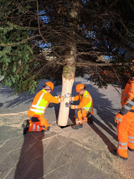 Heute wurden die Weihnachtsbäume im Stadtgebiet durch die Mitarbeiter des städtischen Bauhofes aufgestellt. Nachdem sie jeweils bei den Spenderinnen und Spendern gefällt und gesichert wurden, erfolgte der Transport an ihren jeweiligen Bestimmungsort.