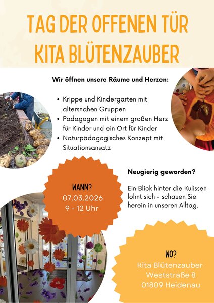 Am Samstag, 7. März 2026, lädt das Kita-Team von 9 bis 12 Uhr ganz herzlich in die Kita Blütenzauber, Weststraße 8, 01809 Heidenau, ein.