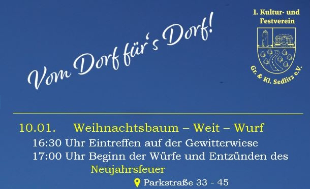 Der 1. Kultur- und Festverein Groß- & Kleinsedlituz lädt ab 16:30 auf die Gewitterwiese Großsedlitz ein. Ab 17 Uhr beginnt der Wettbewerb und im Anschluss dürfen alle Bäume beim Neujahrsfeuer verbrannt werden.