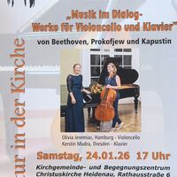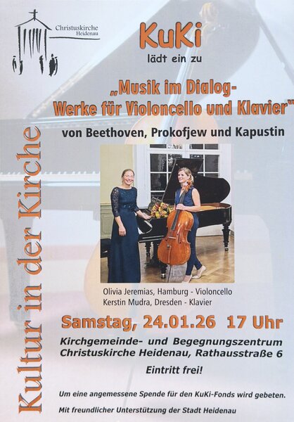 Am 24. Januar lädt das Kirchgemeide- und Begegnungszentrum Chistuskirche in Heidenau zur ersten "Kultur in der Kirche"-Veranstaltung 2026 ein. Unter dem Titel "Musik im Dialog - Werke für Violoncello und Klavier" werden Kompositionen von u. a. Beethoven, Prokofjew und Kapustin zu hören sein. Erleben Sie Olivia Jeremias aus Hamburg am Violoncello, begleitet von Kerstin Mudra aus Dresden am Klavier. Der Eintritt ist wie immer frei und es wird um eine angemessene Spende für den KuKi-Fonds gebeten um weiterhin diese Veranstaltungsreihe finanzieren und beleben zu können.