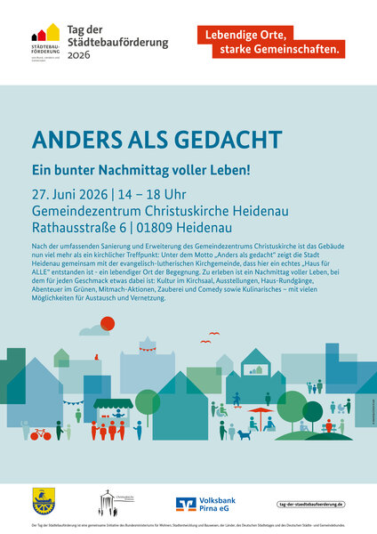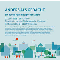 Nach der umfassenden Sanierung und Erweiterung des Gemeindezentrums Christuskirche ist das Gebäude nun viel mehr als ein kirchlicher Treffpunkt: Unter dem Motto „Anders als gedacht“ zeigt die Stadt Heidenau gemeinsam mit der evangelisch-lutherischen Kirchgemeinde, dass hier ein echtes „Haus für ALLE“ entstanden ist - ein lebendiger Ort der Begegnung. Zu erleben ist ein Nachmittag voller Leben, bei dem für jeden Geschmack etwas dabei ist: Kultur im Kirchsaal, Ausstellungen, Haus-Rundgänge, Abenteuer im Grünen, Mitmach-Aktionen, Zauberei und Comedy sowie Kulinarisches – mit vielen Möglichkeiten für Austausch und Vernetzung.